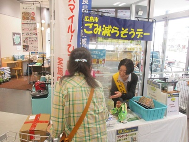 広島市ごみ減量・リサイクル実行委員会は、毎月1日を「ごみ減らそうデー」として、市内のスーパーマーケットの店頭で、パネル展示やチラシの配布、アンケート調査、買い物袋持参率調査などを行い、ごみの減量・リサイクルと食品ロス削減に向けた啓発活動を行っています。